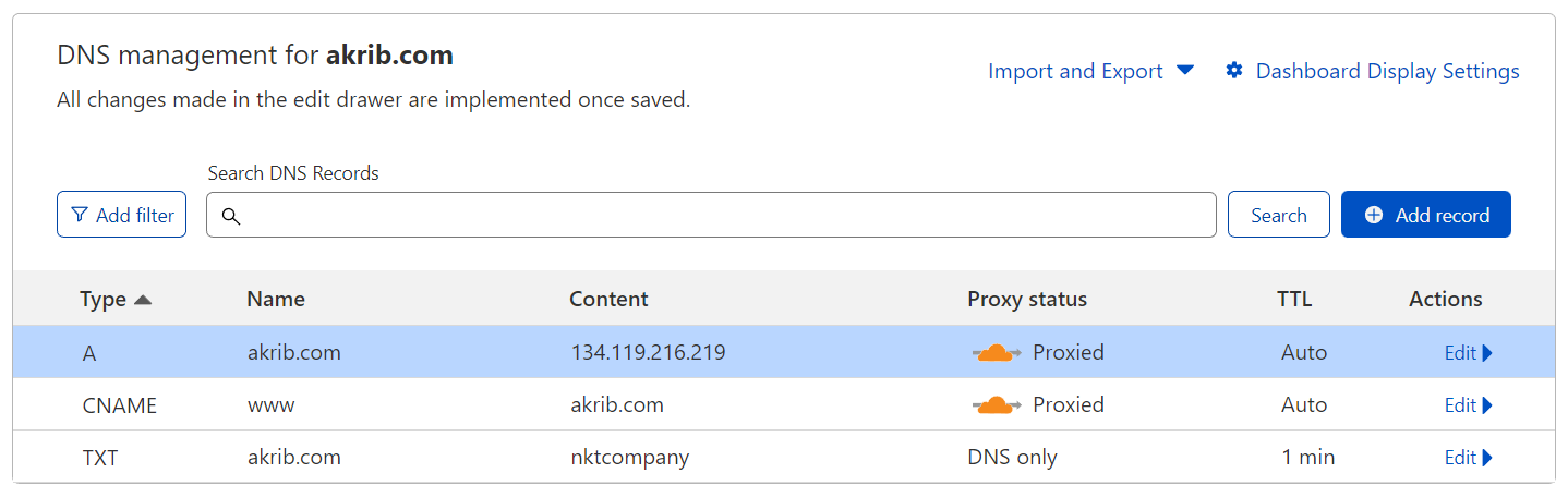 | Type | Host | Value | TTL |